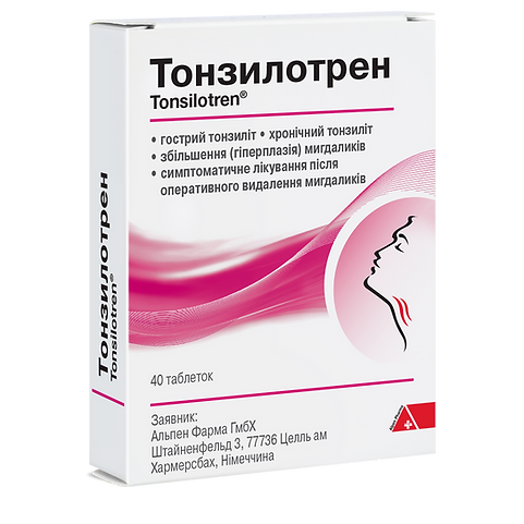 Реклама лікарського засобу. Перед застосуванням необхідно проконсультуватися з лікарем та обов’язково ознайомитися з інструкцією. Зберігати в недоступному для дітей місці. Є протипоказання та побічні реакції. Тонзилотрен, таблетки; по 20 таблеток у блістері; по 2 блістери у картонній коробці. РП UA/3781/01/01, термін дії необмежений з 30.07.2020. Виробник: Др. Густав Кляйн ГмбХ & Ко. КГ, Німеччина. Представник в Україні: Альпен Фарма АГ. Дистриб'ютор: ПрАТ «Натурфарм» вул. Лісна 30а, м. Київ, Україна, 04075, телефон +38 (044) 401 81 03. Якщо Ви хочете повідомити про виникнення побічної реакції і/або маєте запитання стосовно медичної інформації і/або скарги на якість лікарського засобу, будь ласка, надсилайте листа на електронну адресу: pharmacovigilance-ua@alpenpharma.com.